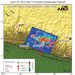 The modeled slip on the fault is shown as viewed from above and indicated by the colors and contours within the rectangle. The peak slip in the fault exceeds 19.7 feet (6 meters). The ground motion measured with GPS is shown by the red and purple arrows and was used to develop the fault slip model. Aftershocks are indicated by red dots. Background color and shaded relief reflect regional variations in topography. The barbed lines show where the main fault reaches Earth's surface.