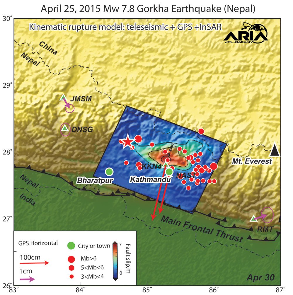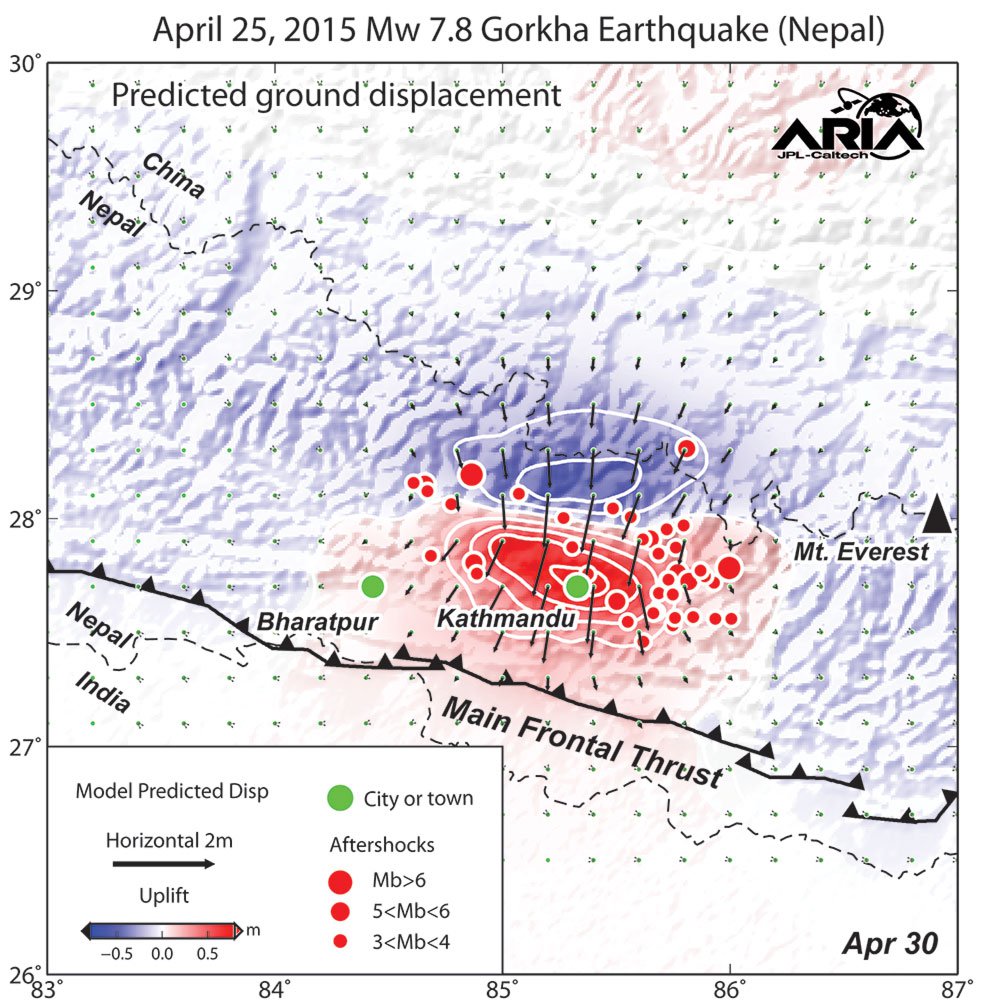The team's observations and models of the April 25, 2015 earthquake, produced through the Advanced Rapid Imaging and Analysis (ARIA) project—a collaboration between Caltech and JPL—include preliminary estimates of the slippage of the fault beneath Earth's surface that resulted in the deaths of thousands of people. In addition, the ARIA scientists have provided first responders and key officials in Nepal with information and maps that show block-by-block building devastation as well as measurements of ground movement at individual locations around the country.