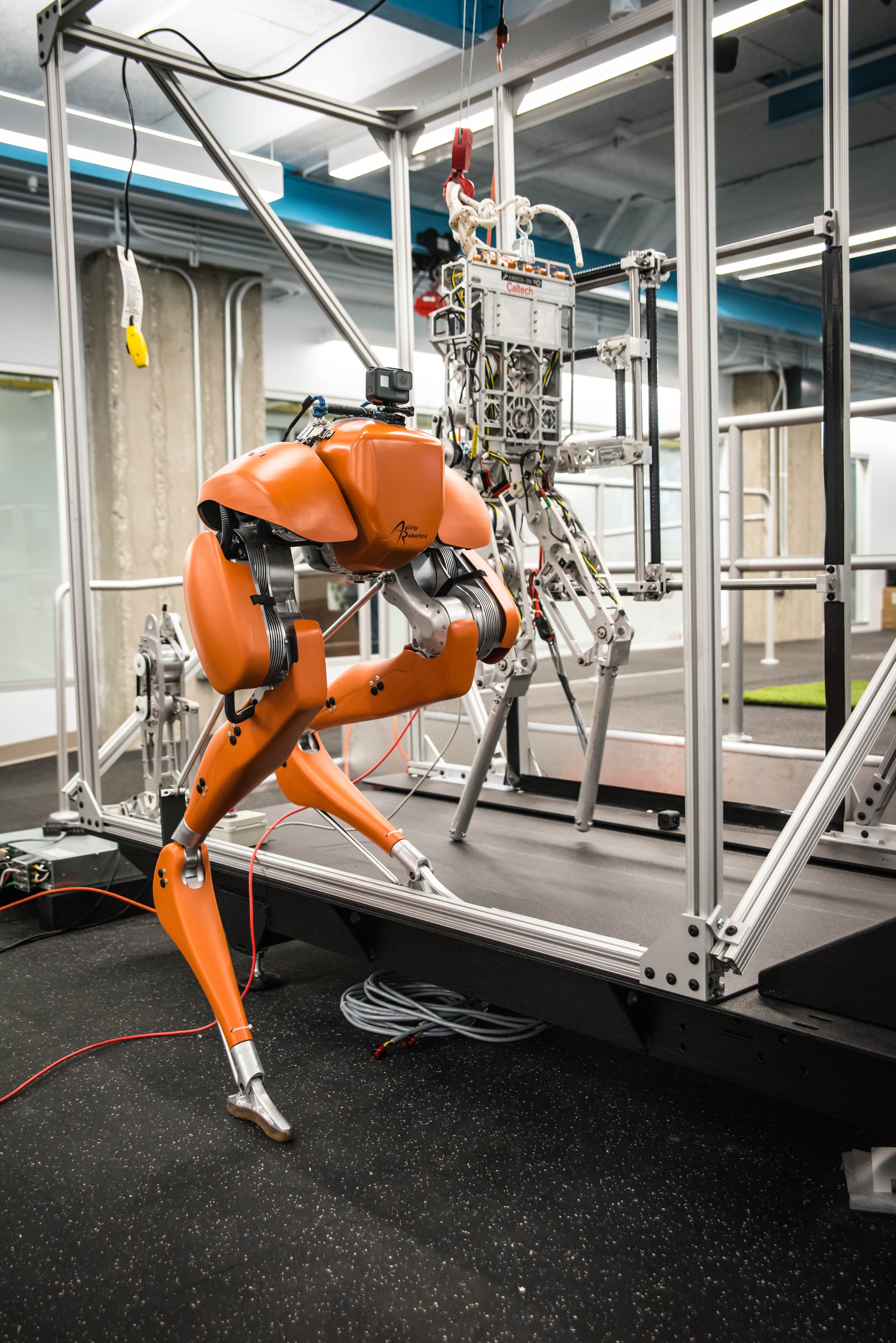 Bipedal robot Cassie and one of her custom-built counterparts walk through the 2,500-square-foot Advanced Mobility Lab. The lab includes multiple tracks and a 15-foot-long treadmill capable of reaching speeds of up to 40 miles per hour for testing high-speed robotic running gaits.