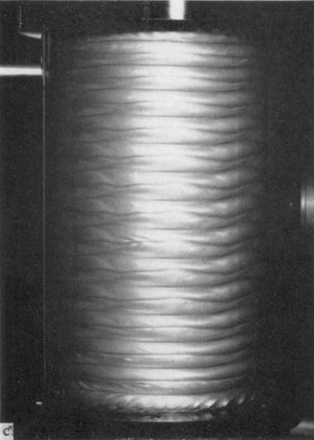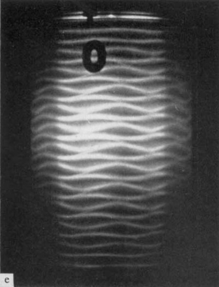 When the outer cylinder was locked down and the inner one gradually spun faster and faster, paired sets of parallel bright and dark bands would suddenly fill the cylinder from top to bottom. Each pair of bands represented the top of a convection cell—the fluid near the spinning inner cylinder was flung outward by centrifugal force; meanwhile, the outermost fluid would drift inward, slowed down by the drag exerted on it by the stationary outer cylinder. The situation is similar to the large convective cells of hot air rising and cold air sinking that drive our planet's weather systems; in fact, both are called Taylor cells. As the inner cylinder's speed slowly increased, the bands began to undulate in waves traveling in the same direction at about one-third of the cylinder's speed. Then, as the cylinder revved ever faster, a second set of independent waves would suddenly burst into being, superimposing itself on the first set. This "doubly periodic flow," Coles would later write, had "a fascinating peculiarity"—"the flow pattern was observed to change abruptly, discontinuously, and irreversibly from one state to another at certain well defined and repeatable critical speeds."