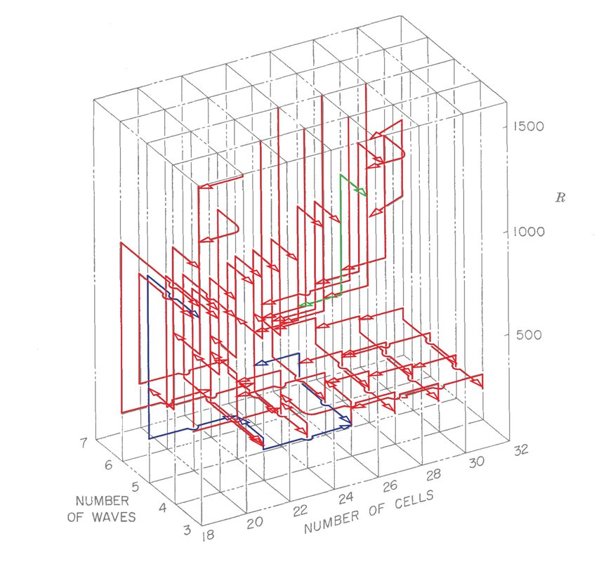 Coles plotted the transitions from state to state in this 3-D graph. (The vertical axis, R, is proportional to the inner cylinder's rotation speed.) The topmost green arrowhead marks the 28/5 state shown in the previous image; the set of blue double-headed arrows traces a reversible sequence of transitions.