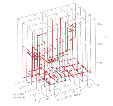 Each state consisted of a specific number of Taylor cells undulating an integral number of times around the apparatus's circumference. While the number of cells and the number of waves in each state could be predicted from Taylor's equations, the transitions from one state to another could not. Coles cataloged 74 distinct transitions, and by plotting the order in which they occurred, he discovered that "at any specified speed . . . there exists a variety of possible operating states, sometimes more than 20 in number, among which the one actually observed is determined by the whole previous history of the experiment." Subtle differences in initial conditions could produce markedly different results, yet every pathway was repeatable. Coles summarized a decade's worth of work on Couette flows in a 40-page, lavishly illustrated paper that appeared in the Journal of Fluid Mechanics in 1965. The paper, which continues to be cited more than 1,000 times a year, has led to advances in the mathematics of group theory as well as in fluid mechanics.