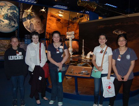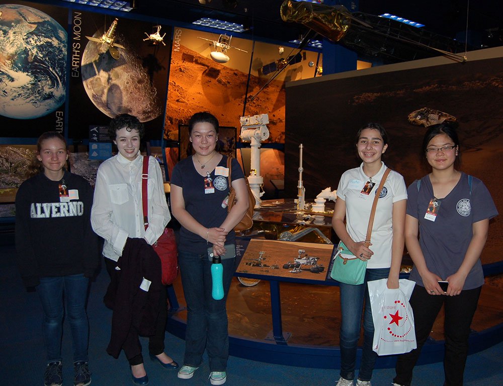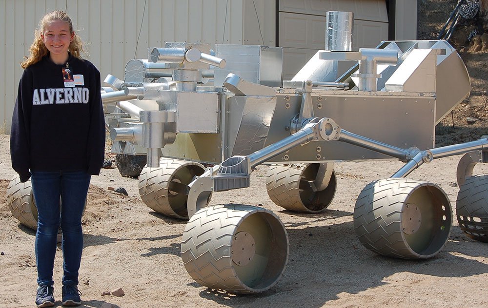 An Alverno student in front of a replica Mars Curiosity rover at JPL.