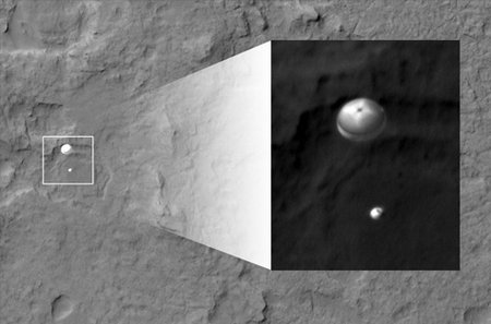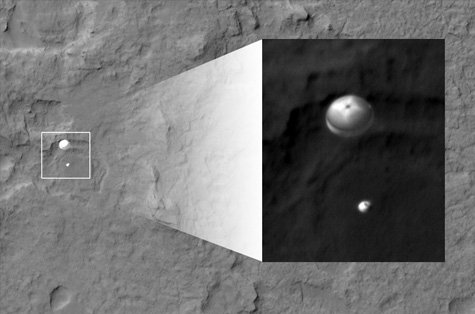 The Mars Reconnaissance Orbiter snapped this shot of the MSL spacecraft with its parachute deployed as it headed toward a successful landing.
