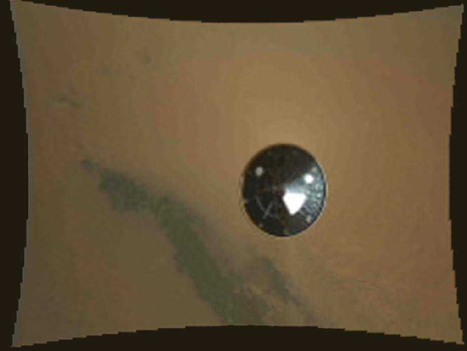 MSL took this photo of the spacecraft's heat shield three seconds after it was deployed and about two and a half minutes before landing. The image was obtained by the Mars Descent Imager instrument known as MARDI.
