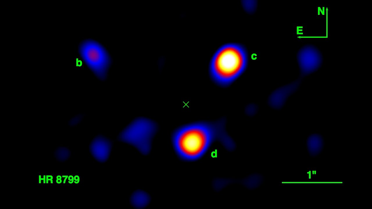 The star HR 8799 has three planets (b, c, and d) that can be seen with the vortex coronagraph. The 'X' marks the nulled-out star's position.
