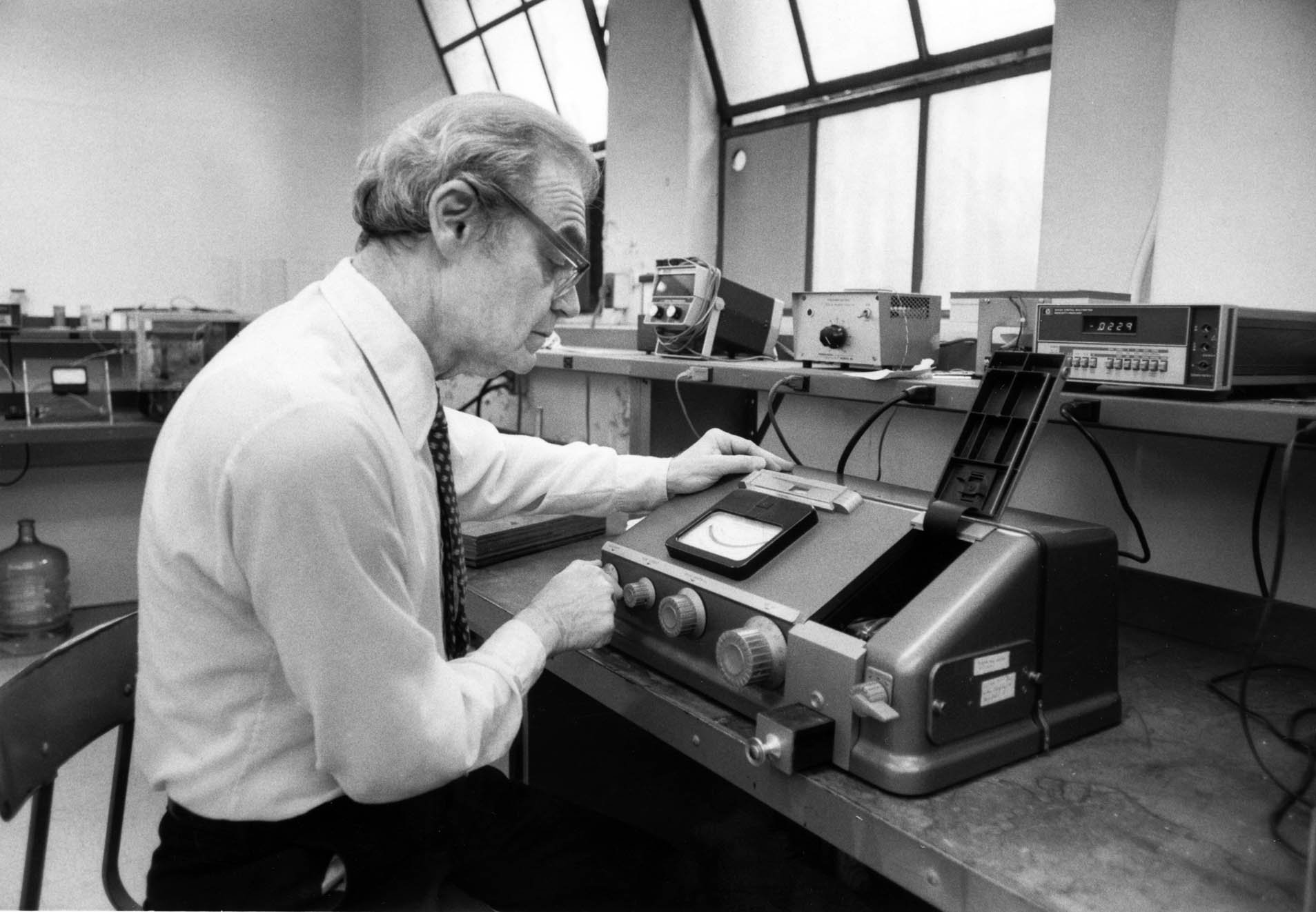 Rolf Sabersky uses a 3O-year-old Model B spectrophotometer from Beckman Instruments in this photo from the May 1986 issue of Caltech's E&S magazine.