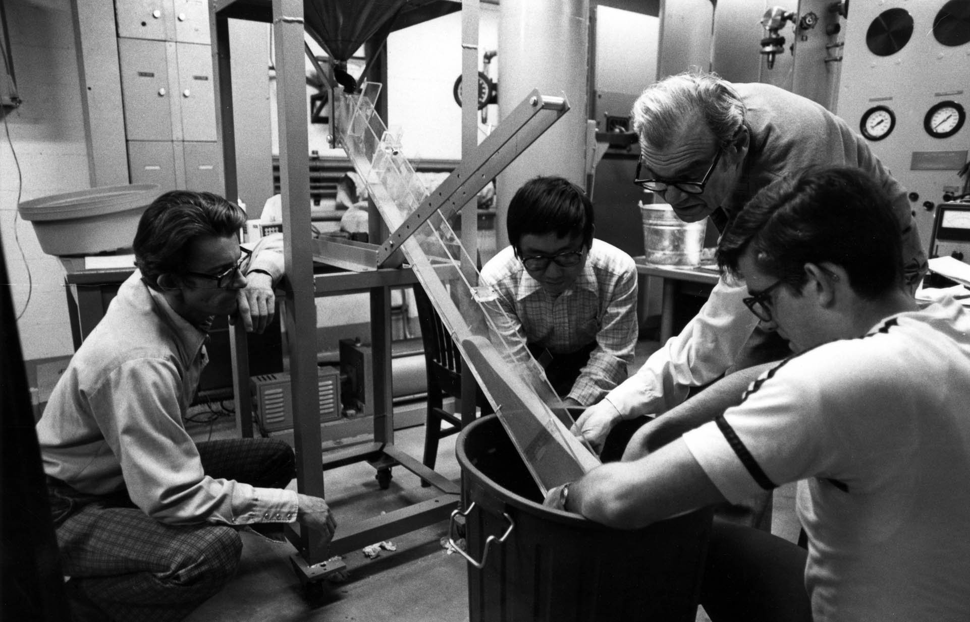 Rolf Sabersky points out an element of sand flow to students Henry King (center) and Bill Ledeboer. Christopher Brennen observes at left.