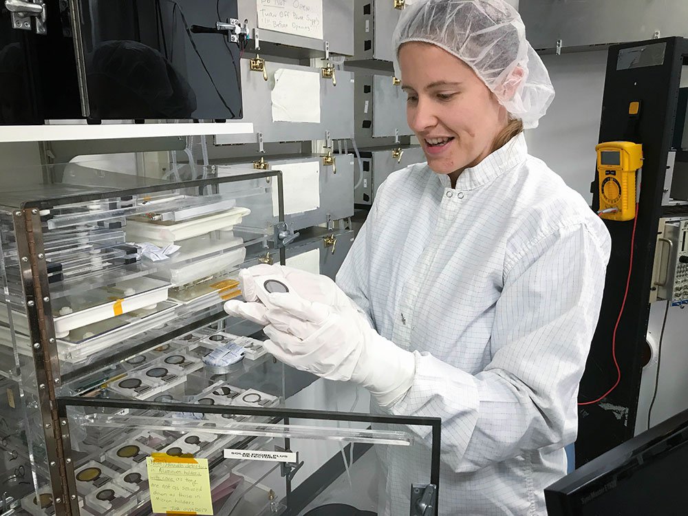 Jamie Rankin is seen holding a silicon detector similar to the ones onboard NASA's Parker Solar Probe. She helped test the detectors, getting them ready for flight, at Caltech.