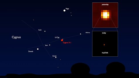 NASA's NuSTAR space telescope has taken its first image, snapping a shot of the high-energy X rays from a black hole in the constellation Cygnus. NuSTAR—short for Nuclear Spectroscopic Telescope Array—was launched on June 13, and is the first telescope that can focus high-energy X rays. It will explore black holes, the dense remnants of dead stars, energetic cosmic explosions, and even our very own sun.