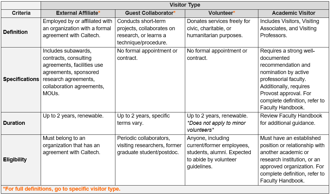 For tips to help you determine your visitor type, please review the quick facts below for external affiliates, guest collaborators, volunteers, and academic visitors. For detailed information, please visit the Visitor Types section above.